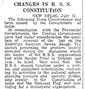 കത്തെഴുത്തുകൾക്കും കൂടിക്കാഴ്ചകൾക്കുമൊടുവിൽ നിരോധനം പിൻവലിക്കാൻ സർക്കാർ ചില ഉപാധികൾ വെച്ചു. അതിലൊന്നായിരുന്നു ആർഎസ്എസിന് എഴുതിയുണ്ടാക്കിയ ഒരു ഭരണഘടന വേണമെന്ന ആവശ്യം. മനസ്സില്ലാമനസ്സോടെ അതിന് ആർഎസ്എസ് വഴങ്ങി.