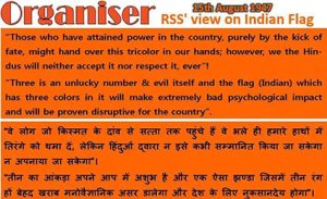ഭരണഘടനാ അസംബ്ലി ത്രിവർണ പതാക ദേശീയ പതാകയായി തീരുമാനിച്ചപ്പോൾ തന്നെ ആർ എസ് എസ് മുഖപത്രമായ ഓർഗനൈസർ മുഖപ്രസംഗം എഴുതി. മൂന്ന് എന്ന വാക്കുപോലും തിന്മയാണെന്നും മൂന്നു നിറമുള്ള കൊടി ഇന്ത്യക്കാർക്ക് മാനസികവിഭ്രാന്തിയുണ്ടാക്കുമെന്നും രാഷ്ട്രത്തിന് ഹാനികരമാകുമെന്നുമൊക്കെയായിരുന്നു വ്യാഖ്യാനം.