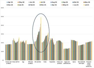 ഇതെന്താ ഇങ്ങനെ എന്ന് നോക്കുമ്പോഴാണ് കാര്യം പിടികിട്ടുക. ചിത്രം 4 കാണുക. 2024 ഏപ്രിൽ, ജൂൺ, ജൂലൈ മാസങ്ങളെ അപേക്ഷിച്ച് 2025 ഏപ്രിൽ, ജൂൺ, ജൂലൈ മാസങ്ങളിൽ, “ഭക്ഷണപാനീയങ്ങൾ’ എന്ന ഈ കൂട്ടത്തിനുള്ളിലെ ഭക്ഷ്യധാന്യങ്ങൾക്ക് വില കൂടിയിട്ടില്ല; ഇറച്ചിക്കും മീനിനും മുട്ടയ്ക്കും വില കൂടിയിട്ടില്ല; പാലിന് വില കൂടിയിട്ടില്ല; പച്ചക്കറിക്ക് വില കുറഞ്ഞു; പയർവർഗങ്ങൾക്ക് വില കുറഞ്ഞു; സുഗന്ധവ്യഞ്ജനങ്ങൾക്ക് വില കുറഞ്ഞു; പഞ്ചസാരയ്-ക്ക് വില കൂടിയിട്ടില്ല; മദ്യം അല്ലാത്ത പാനീയങ്ങൾക്കും വില അങ്ങനെ കൂടിയിട്ടില്ല; പാചകം ചെയ്ത ഭക്ഷണങ്ങൾക്കും മധുര പലഹാരങ്ങൾക്കും വലുതായി വില കൂടിയിട്ടില്ല. ഭക്ഷണപാനീയങ്ങൾക്കുള്ളിലെ രണ്ട് ചെറിയ ഗ്രൂപ്പുകളിൽ മാത്രമാണ് വില കൂടിയിട്ടുള്ളത്. ഒന്ന്, oils and fats അഥവാ എണ്ണകളും കൊഴുപ്പുകളും. രണ്ട്, fruits അഥവാ പഴവർഗങ്ങൾ. “എണ്ണകളും കൊഴുപ്പുകളും’ എന്ന കൂട്ടത്തിൽ ഏറ്റവും പ്രധാനം വെളിച്ചെണ്ണയാണ്. “പഴവർഗങ്ങൾ’ എന്ന കൂട്ടത്തിൽപ്പെടുത്തിയിട്ടുള്ള ഒരു പ്രധാന ഇനം നാളികേരമാണ്.