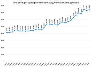 കേരളത്തിലെ ഒരു പവൻ സ്വർണ്ണത്തിന്റെ കഴിഞ്ഞ രണ്ടര വർഷത്തെ മാസവിലകളാണ് ചിത്രം 6ൽ കൊടുത്തിട്ടുള്ളത്. പലവക അതിന്റെ വില്ലത്തരം കാട്ടിത്തുടങ്ങിയ 2024 ഫെബ്രുവരി മുതൽ സ്വർണ്ണവിലകൾ അഭൂതപൂർവ്വമായാണ് കേരളത്തിൽ കൂടിയത്. ഏകദേശം ₹42,000 മുതൽ ₹45,000 വരെ ഒരു പവന് ഉണ്ടായിരുന്ന വില ആഗസ്ത് 2025 ആയപ്പോൾ ₹74,240 ആയി കൂടി. വെള്ളി അടക്കമുള്ള മറ്റ് ആഭരണ വിലകൾ ഇവിടെ വിശകലനം ചെയ്യുന്നില്ല; അവയുടെ വിലയും വർദ്ധിച്ചിട്ടുണ്ട്. പക്ഷേ സ്വർണ്ണവിലകൾ കൂടിയതോടുകൂടി പലവകകളുടെ ഇൻഫ്ലേഷൻ കുതിച്ചുചാടി. സ്വർണ്ണം നന്നായി വാങ്ങി സൂക്ഷിക്കുന്നവർ ആണല്ലോ മലയാളികൾ. കഴിഞ്ഞ മൂന്നു വർഷങ്ങളിൽ സ്റ്റോക്ക് മാർക്കറ്റിൽ നിക്ഷേപിക്കുന്നതിനേക്കാൾ ലാഭം സ്വർണം വാങ്ങുന്നതിലാണ് എന്നുകാണാം.