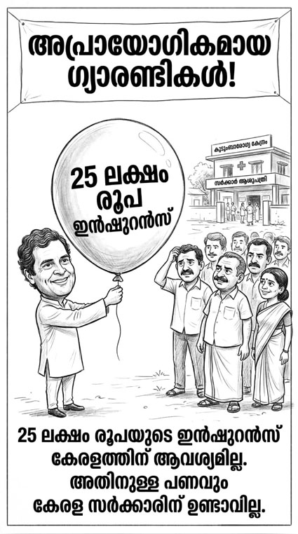 എന്നാൽ യു.ഡി.എഫിന്റെ 25 ലക്ഷം രൂപയുടെ ഗ്യാരന്റി ഇതിന്റെ നേർവിപരീത പാതയെ പ്രതിനിധീകരിക്കുന്നതാണ്. ഇത് അസാധ്യമായൊരു ഇൻഷുറൻസ് ഗണിതശാസ്ത്രത്തിൽ പടുത്തുയർത്തിയ തലക്കെട്ടാണ്; സുസ്ഥിരമല്ലാത്ത ഒരു സാമ്പത്തിക ബാധ്യതയാണ്; പൊതു ഫണ്ടുകൾ സ്വകാര്യ ഇൻഷുറർമാർക്കും സ്വകാര്യ ആശുപത്രികൾക്കും കൈമാറുന്ന ഒരു ഘടനയാണ്; കാലക്രമേണ കേരളത്തിന്റെ ആരോഗ്യ സുരക്ഷയുടെ യഥാർത്ഥ ഉറവിടമായ പൊതുജനാരോഗ്യ സംവിധാനത്തെ കാർന്നുതിന്നുന്ന ഒരു നയദിശയുമാണ്.
