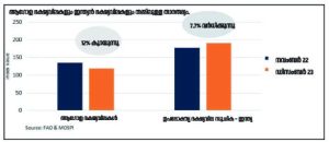 ♦ 2020–21 നുശേഷമുണ്ടായ വിലക്കയറ്റത്തിന്റെയാകെ കാരണം ഉക്രൈൻ യുദ്ധവും അതുമൂലമുണ്ടായ ഇന്ധനവില വർധനവുമാണെന്ന് കേന്ദ്ര സർക്കാർ അവകാശപ്പെടുമ്പോൾ, യഥാർഥത്തിൽ ഭക്ഷ്യസാധനങ്ങളുടെ വിലയാണ് ഈ കാലത്തും കുത്തനെ വർധിച്ചത്. എന്നാൽ ഇതേകാലത്ത് ആശ്വാസകരമായ വിധം ആഭ്യന്തരഭക്ഷേ-്യാൽപ്പാദനം വർധിച്ചിട്ടുണ്ടെന്നതാണ് വസ്തുത. അതുപോലെ തന്നെ സാധാരണയിൽ കുറഞ്ഞ മഴ ഭക്ഷേ-്യാൽപ്പാദനത്തിൽ എന്തുതരം ആഘാതമാണുണ്ടാക്കുകയെന്നതും ഇപ്പോൾ തന്നെ ഉയർന്ന ഭക്ഷ്യവിലകളെ അതെങ്ങനെ ബാധിക്കുമെന്നതും അസ്വസ്ഥതയുണ്ടാക്കുന്ന കാര്യമാണ്.