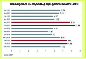 ♦ ഭക്ഷ്യവിലകൾ ദേശീയാടിസ്ഥാനത്തിൽ 9.5 % വർധിക്കുകയും നഗര ഉപഭോക്താക്കളെ സംബന്ധിച്ചുണ്ടായിരുന്ന 10% വിലക്കയറ്റം എന്നത് അതിനപ്പുറം എത്തുകയും ചെയ്തു. വർഷാവർഷാടിസ്ഥാനത്തിൽ ഭക്ഷ്യവിലക്കയറ്റം തുടർച്ചയായി വർധിച്ചുവരികയാണ്. അതേസമയം ഭക്ഷ്യസാധനങ്ങളുടെയും ഇന്ധനങ്ങളുടെയും വില ഒഴികെയുള്ളവയുടെ വിലക്കയറ്റം 3.77 ശതമാനമായി ലഘൂകരിക്കപ്പെട്ടു. തുടർച്ചയായ 51 മാസങ്ങളിലെ ചില്ലറ വിൽപ്പനയിലെ വിലക്കയറ്റം റിസർവ് ബാങ്കിന്റെ മീഡിയം ടേം ടാർജറ്റിന്റെ 4% ആണ്.