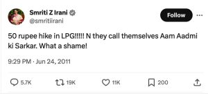 | സ്മൃതി ഇറാനിയുടെ ട്വീറ്റിന്റെ (2011 ജൂൺ 24) പരിഭാഷ: (എൽപിജിക്ക് 50 രൂപയുടെ വർധനയോ?!!!!! എന്നിട്ടവർ സ്വയം വീമ്പടിക്കുന്നത് അവരാണ് സാധാരണക്കാരുടെ സർക്കാരെന്ന്! എന്തൊരു നാണക്കേട്! |