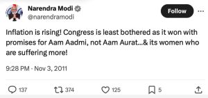 മോദിയുടെ ട്വീറ്റിന്റെ (2011 നവംബർ 3) പരിഭാഷ: വിലക്കയറ്റം മുന്നോട്ട് കുതിക്കുന്നു. സാധാരണക്കാർലോട് (ആം ആദ്മി) വാഗ്ദാനം ചെയ്താണ് അവർ തിരഞ്ഞെടുപ്പ് ജയിച്ചതത്രെ! സാധാരണ സ്ത്രീകളുടോല്ലത്രെ! (ആം ഔരത്). അതെ സ്ത്രീകളാണ് ഇതിന്റെ കെടുതി ഏറ്റവുമധികം അനുഭവിക്കുന്നത്.’’ |